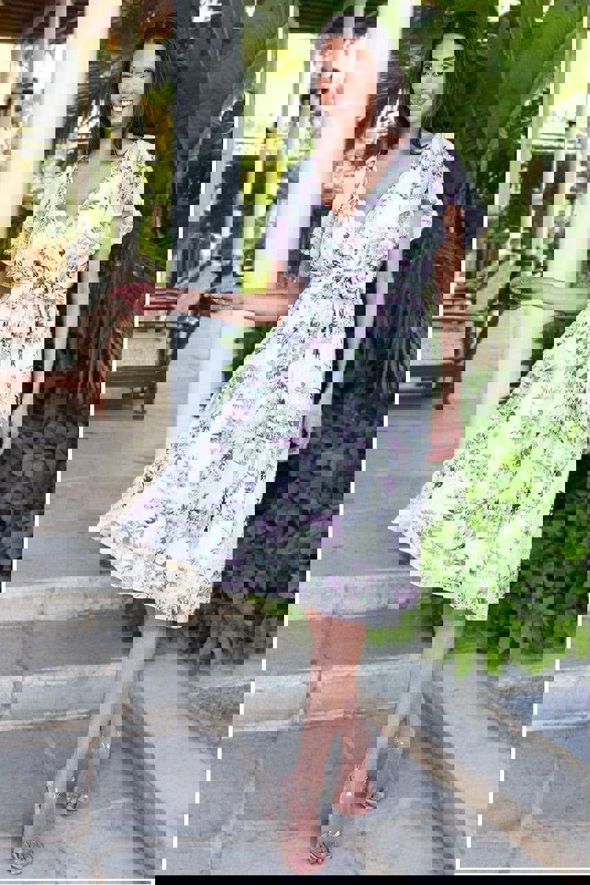 This enchanting dress features a wrap-style V-neckline, adding a touch of sophistication while flattering the silhouette.