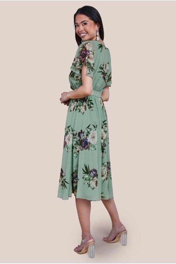 Goddiva Floral Printed Flutter Sleeve Chiffon Midi Dress - Sage Green by Goddiva
