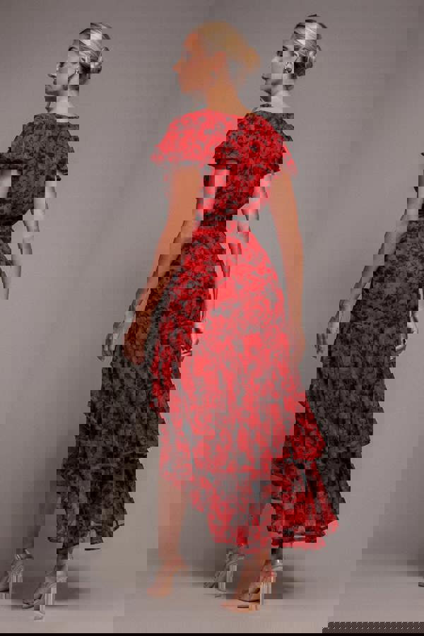 This Floral Wrap High and Low Maxi Dress in Red is all about embracing contemporary elegance with a playful twist.