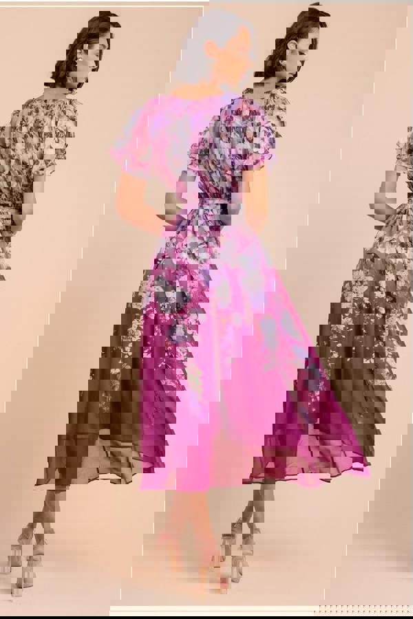 Elevate your wardrobe with the enchanting Flutter Sleeve A-Line Chiffon Floral Printed Midi Dress in Magenta.