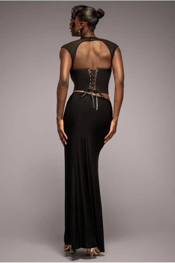 The flowing maxi length in rich black enhances every movement with feminine allure, while the drape detail adds a sophisticated twist to your evening wardrobe.