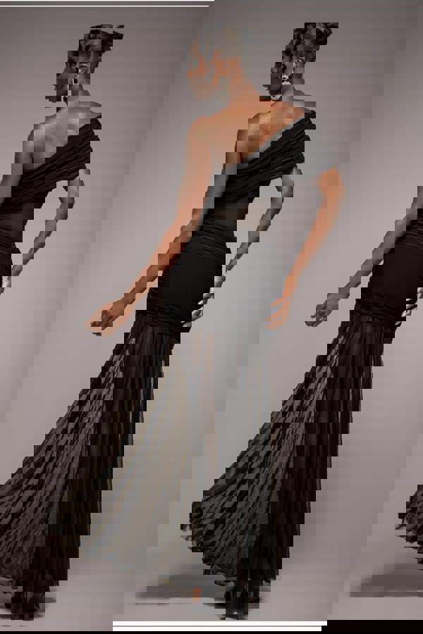 Featuring an elegant one shoulder design and asymmetrical neckline, this black maxi dress flatters the figure while adding a bold, contemporary twist.