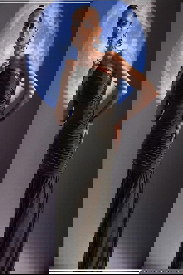 Glamorous and sultry, the Goddiva Gathered One Shoulder Sheer Panel Maxi Dress in Khaki Green is perfect for unforgettable nights out and special occasions.
