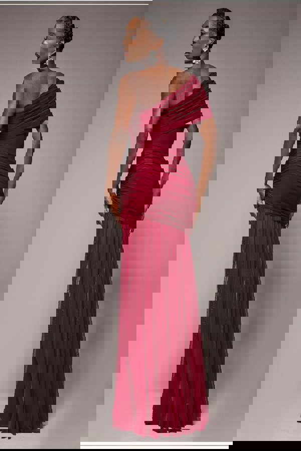 Turn every evening into an unforgettable occasion with the Goddiva Gathered One Shoulder Sheer Panel Maxi Dress in Wine.