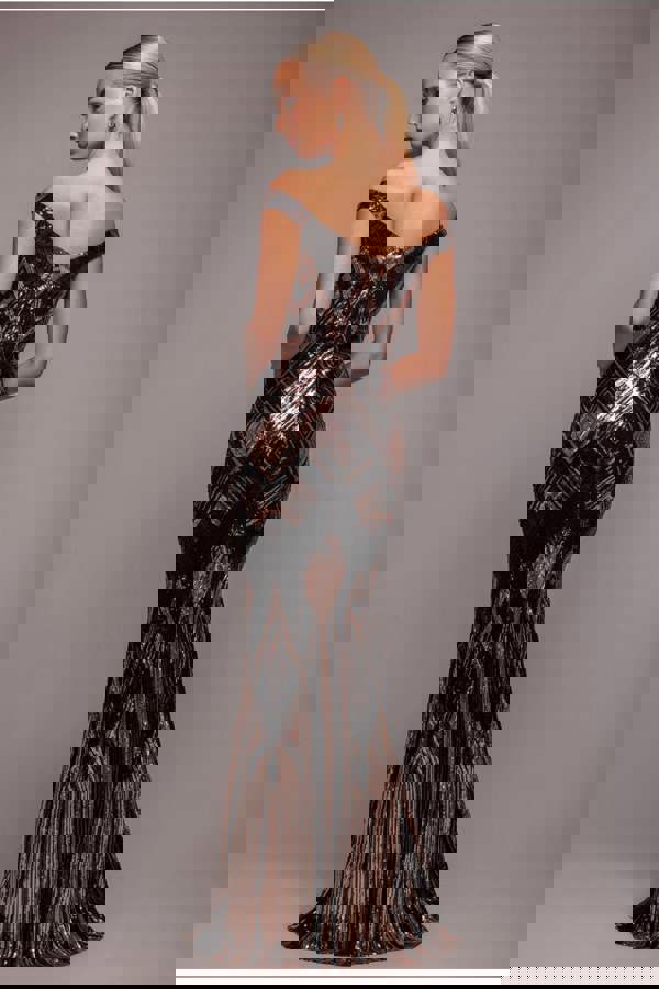 This stunning dress features a mesmerising geometric sequin pattern that catches the light from every angle, creating a dazzling effect that is sure to turn heads.