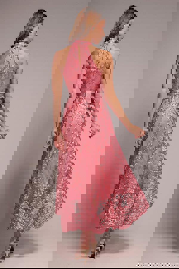 This Goddiva Halter Neck Lace High and Low Dress in Coral is the epitome of modern elegance, bringing together luxury and on-trend fashion.