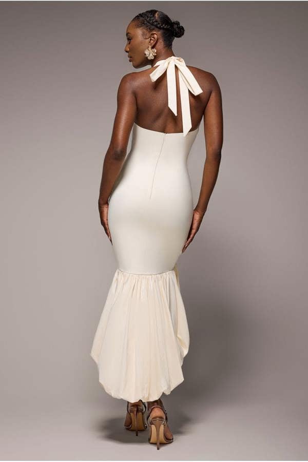 Chic and effortlessly alluring, the Goddiva Halter Neck Puff Hem Mermaid Midaxi Dress in a soft cream shade redefines feminine elegance with a fresh, on-trend silhouette.