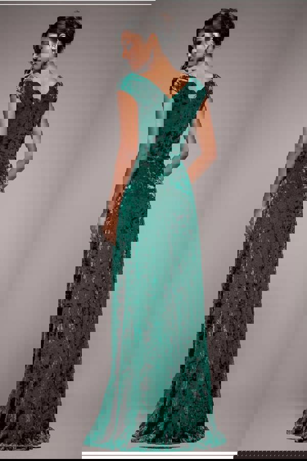 This emerald maxi dress, featuring a captivating wrap-style off-the-shoulder neckline, is a testament to timeless elegance and sophistication.