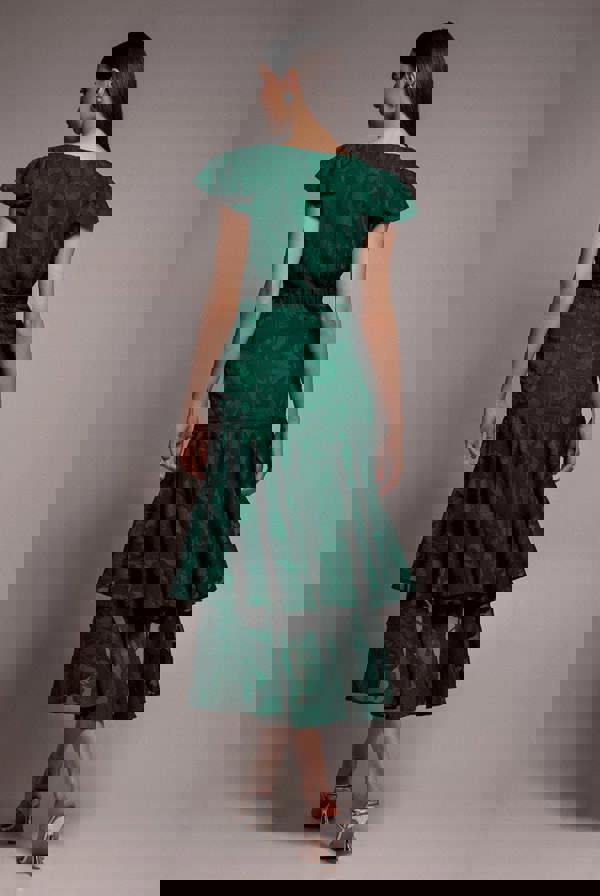 The rich emerald green hue enhances the romantic feel of the jacquard chiffon fabric, draping beautifully with every step.