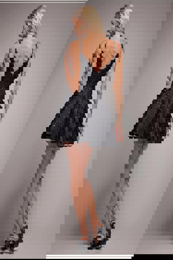Drenched in timeless black, this Goddiva Jacquard Sleeveless A-Line Mini Dress is the definition of effortless elegance with a playful twist.