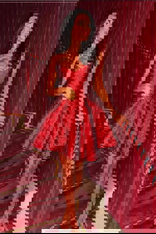 Whether it’s a candlelit dinner, a festive party, or a night of dancing, this red-hot mini dress is pure romance wrapped in opulence.