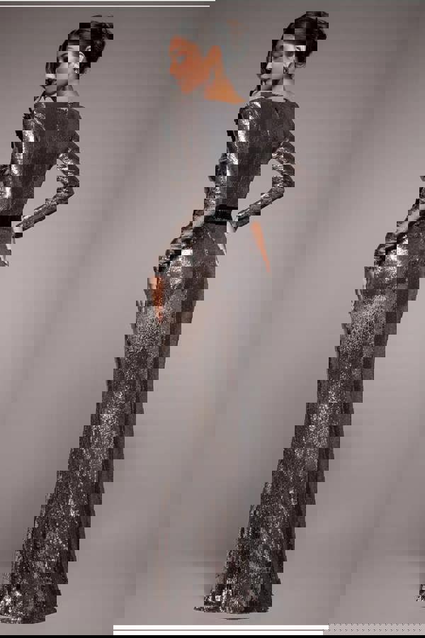 With its liquid sequin allure, this silver evening occasion dress exudes sophistication and style.