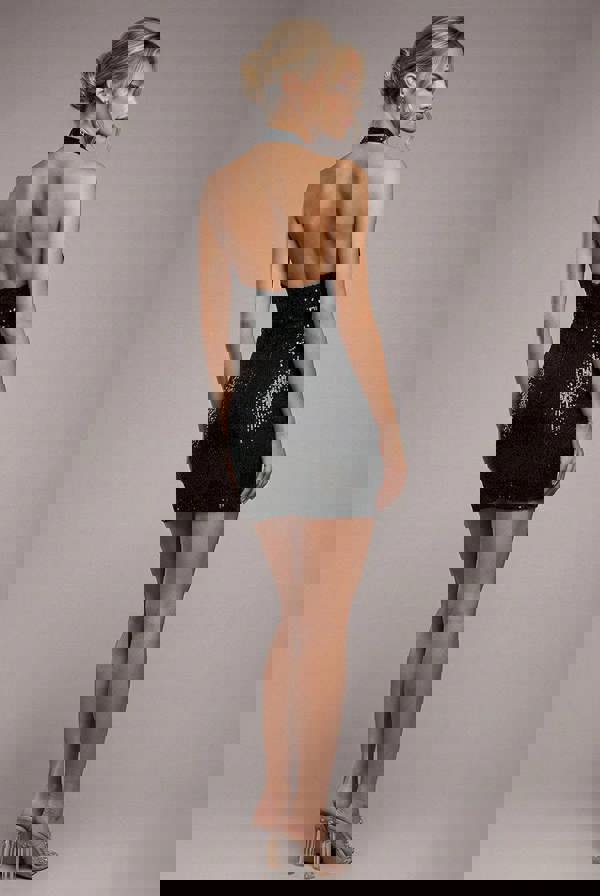High gloss glamour takes over with the Goddiva Liquid Sequin Halterneck Mini With Corsage in Black, designed for unapologetically sexy nights out and luxury after dark dressing.