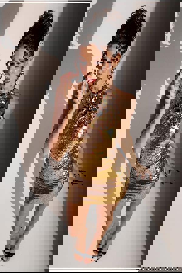 Embrace the night and create unforgettable moments in our Liquid Sequin Halterneck Mini Dress.