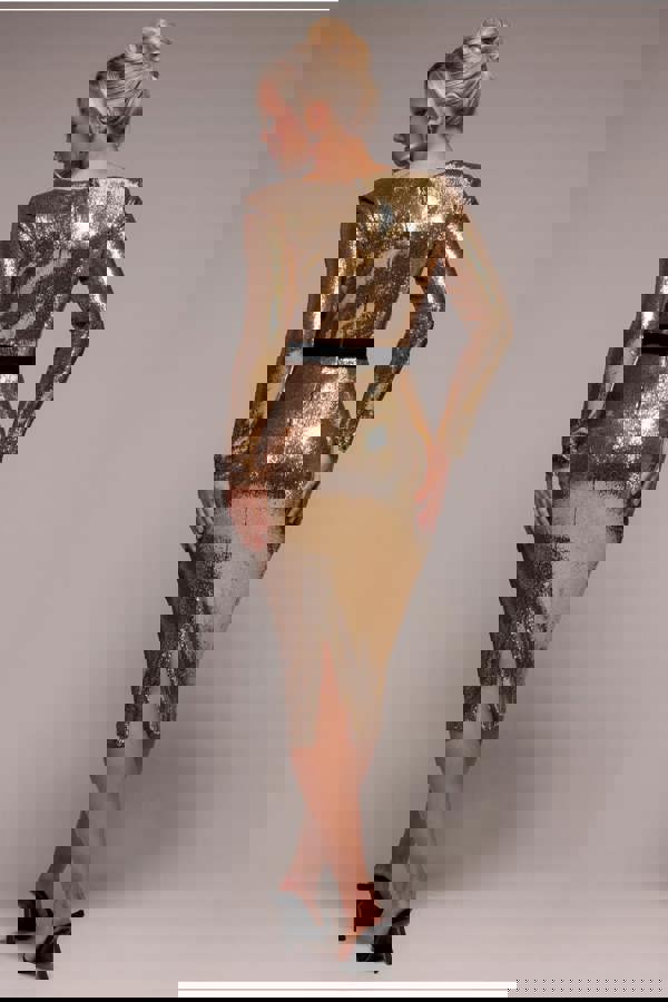 Featuring long sleeves and a bodycon fit, this gold dress keeps you both comfortable and elegant, no matter the celebration.
