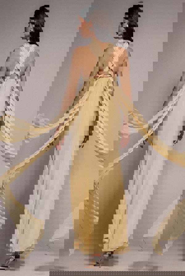 Glow in effortless glamour with the Goddiva Multiway Cape Chiffon Sweetheart Maxi Dress in Butter Yellow.