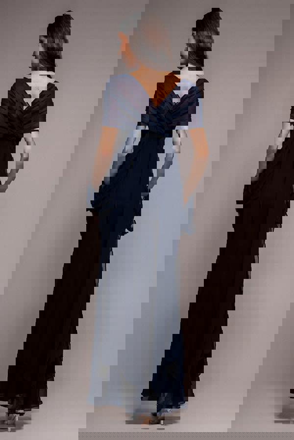 Designed to be styled multiple ways, the flowing chiffon cape can be tied to frame your shoulders, draped over one arm, or worn as you desire for a bespoke look every time.