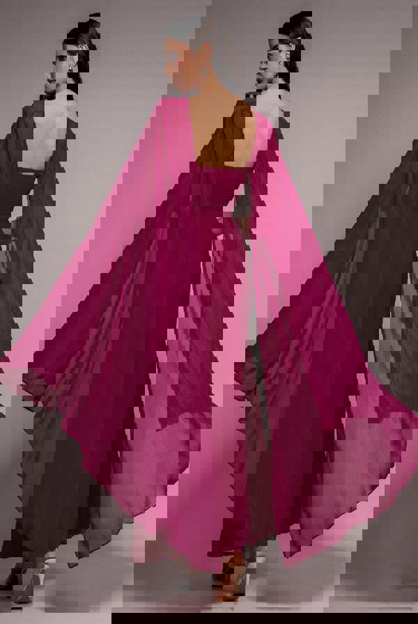 Radiate sultry glamour in the Goddiva Multiway Cape Chiffon with Embellished Trim Maxi Dress in magenta.