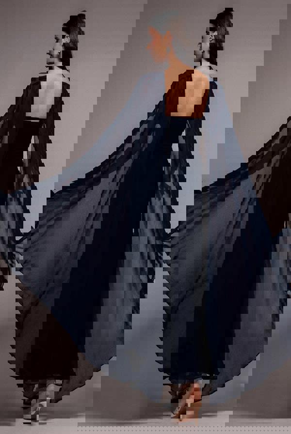 Navy blue glamour with effortless versatility, the Goddiva Multiway Cape Chiffon Maxi Dress exudes luxury at an accessible price.