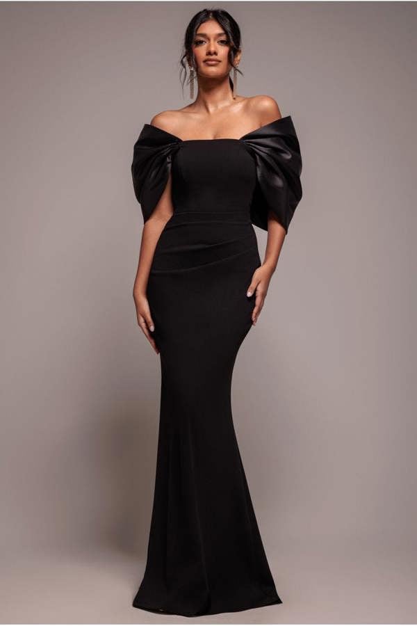 Black is always in, and nothing says luxury quite like the sultry silhouette of this off-shoulder satin bow maxi.