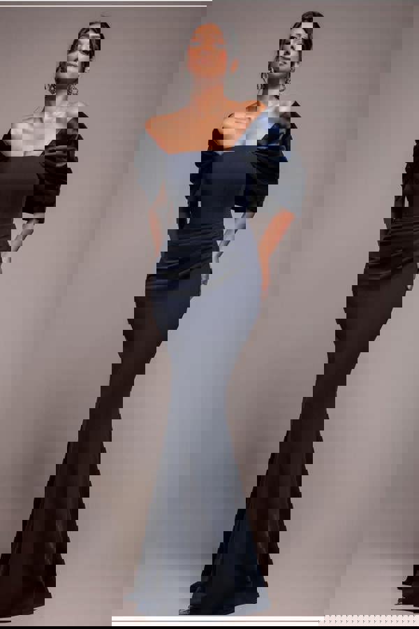 The Goddiva Off Shoulder Back Satin Bow Scuba Maxi Dress brings runway elegance to real life with its ultra-chic strapless cut and sculpted wing sleeves.