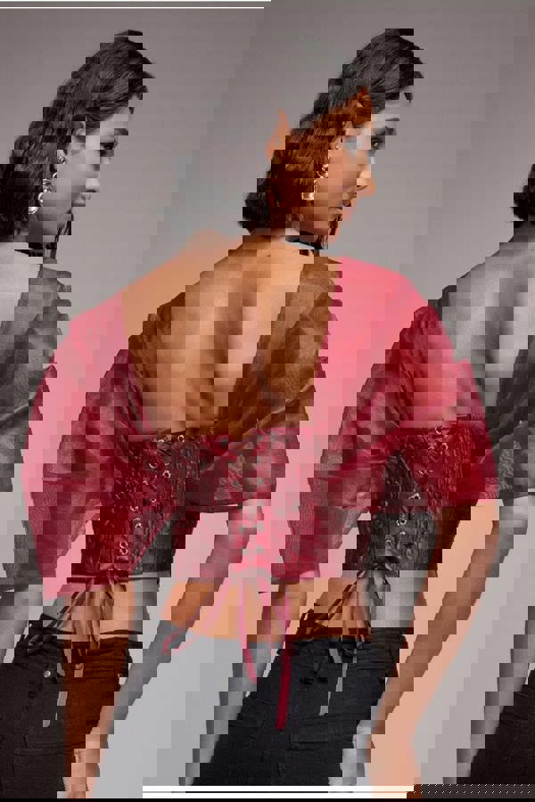 Effortlessly sultry and endlessly versatile, the Goddiva Off Shoulder Jacquard Top with Organza Wings in burgundy red exudes luxury without the hefty price tag.