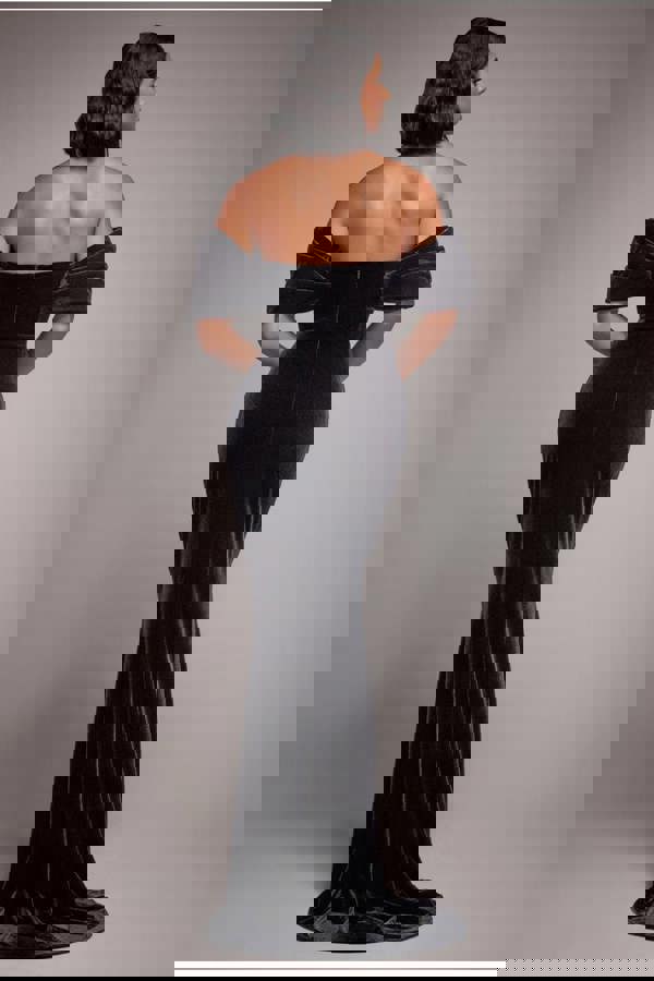 Featuring a daring plunging V neckline and chic off the shoulder design, this limited edition gown exudes sophistication.