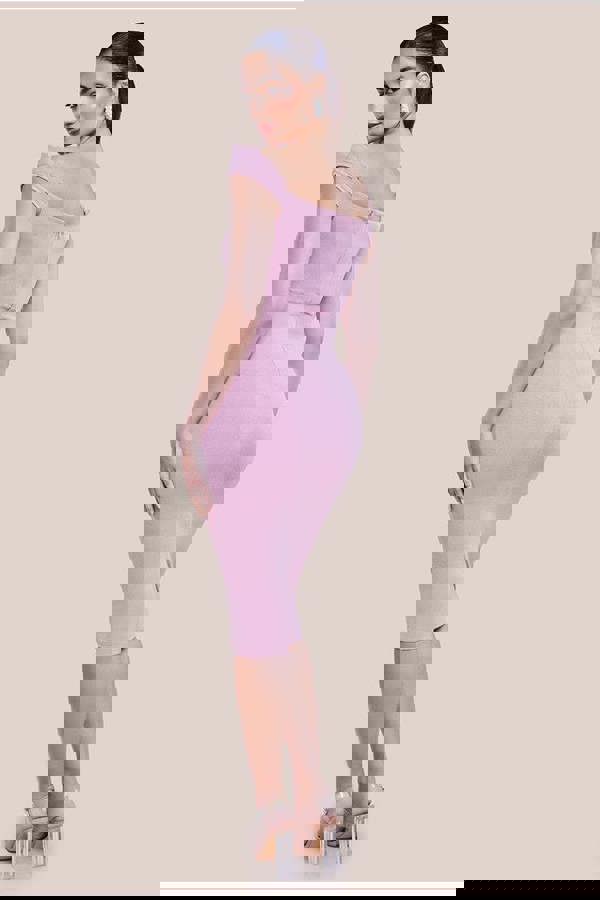 Prepare to captivate hearts with this rose pink Off The Shoulder Frill Bodice Midi Dress, a mesmerising masterpiece destined for unforgettable moments.