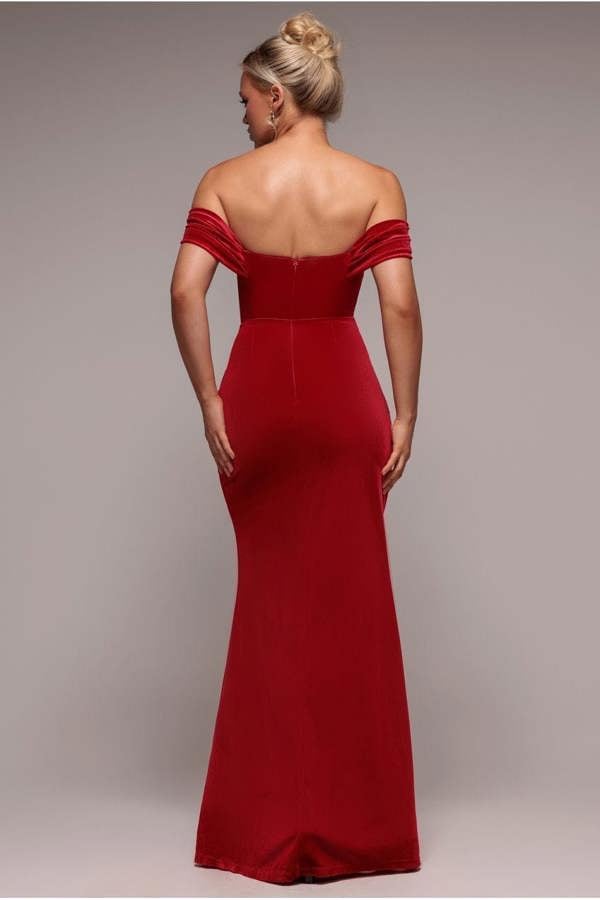 Step into sophistication and allure with the Goddiva Off The Shoulder Front Split Velvet Maxi Dress in Red.