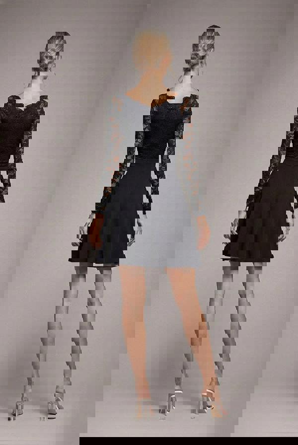 Designed to deliver luxe energy with a sultry edge, this Black mini dress blends romantic lace with a flawless skater silhouette for an ultra feminine finish.