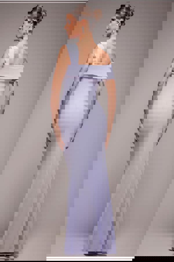 The long length and flattering scuba crepe fabric beautifully highlight your figure, while the soft lilac hue makes this dress a versatile choice for any season or celebration.