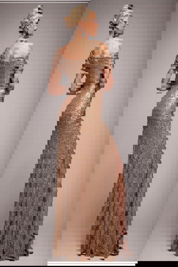 Radiate glamour in the Goddiva Off The Shoulder Sequin Cowl Drawstring Maxi Dress in Gold, designed for nights out, special occasions, and cocktail events.