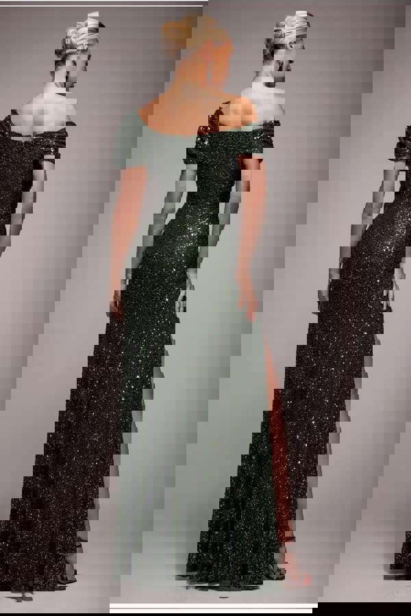 Elevate your evening wardrobe with the Goddiva Off The Shoulder Sequin Cowl Drawstring Maxi Dress in Olive Green.