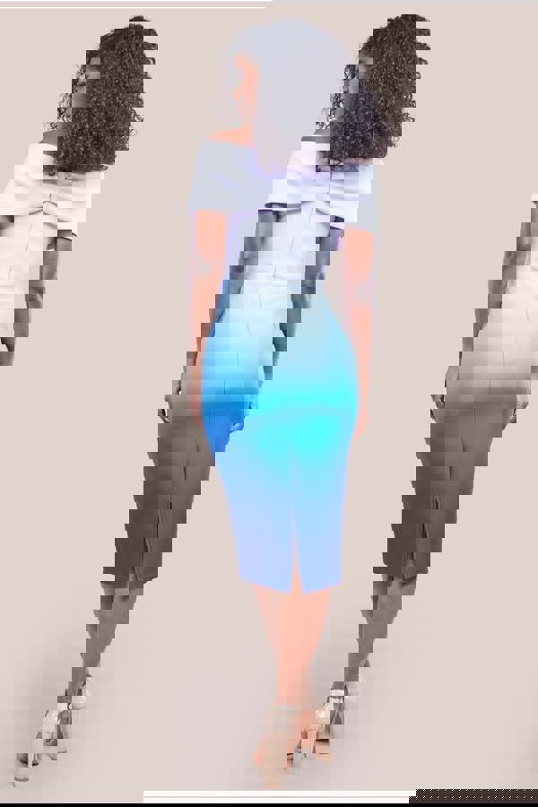 Embrace the warmth of the season in style with our Light Blue Ombre Front Wrap Bardot Midi Dress, your ultimate summer wardrobe essential.