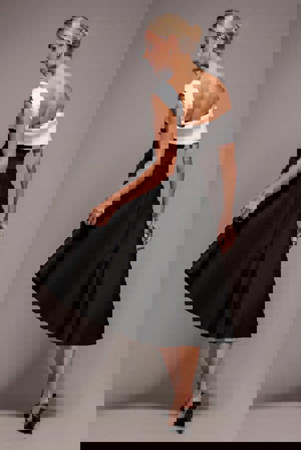 This Black Dress is defined by bold contrast, featuring a Cream Neckline that creates a striking visual moment and an ultra polished finish.