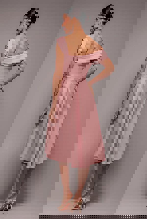 Designed for nights out weddings and upscale parties this blush pink midi dress delivers a high impact look with a refined finish.