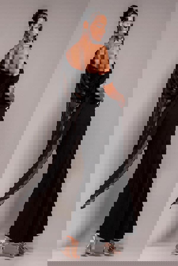Drenched in timeless black, this ultra flattering silhouette blends sculpting scuba fabric with flowing chiffon for a luxe contrast that feels couture inspired yet effortlessly wearable.