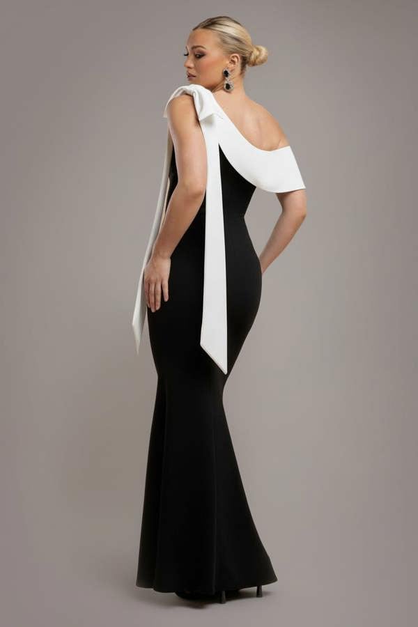 The Goddiva One Shoulder Contrast Bow Maxi Dress in timeless black with a striking cream bow channels pure sophistication with a fashion-forward twist.