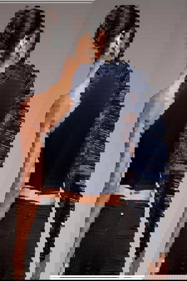 A statement in modern glamour, the Goddiva One Shoulder Fan Pleat Frill Corset Top in navy blue brings an ultra chic aesthetic to your occasion wardrobe.