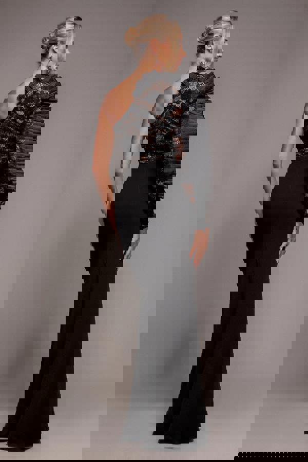 Bring drama and high-fashion energy to your wardrobe with the Goddiva One Shoulder Organza Fan Detail Lace Bodice Maxi Dress in Black.