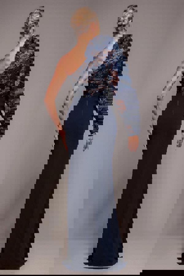 A true showstopper for the season, the Goddiva One Shoulder Organza Fan Detail Lace Bodice Maxi Dress in Navy Blue channels luxury with every detail.