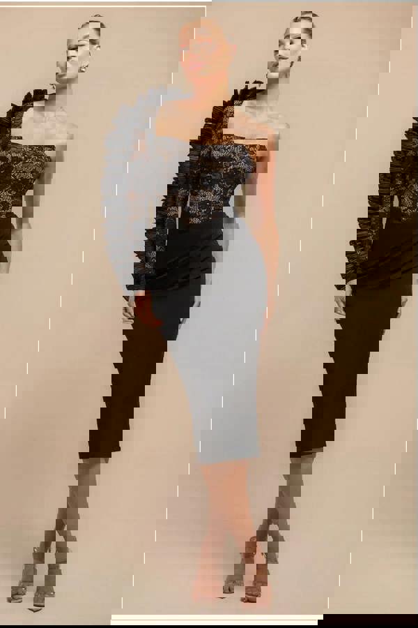 Sculpt your figure with the Goddiva One Shoulder Organza Fan Detail Lace Bodice Midi Dress in Black, a blend of modern elegance and sultry charm.