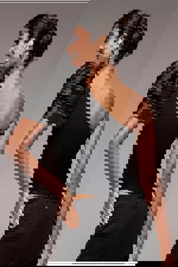 Designed for evenings that demand glamour, this black asymmetric top blends structured scuba fabric with a lustrous satin puff sleeve for an opulent finish that looks far more expensive than its price tag.