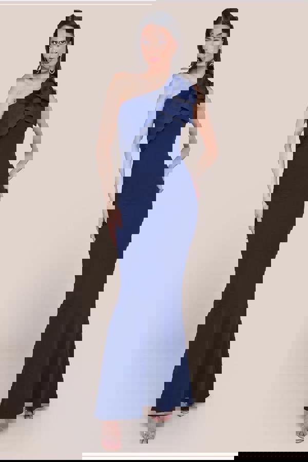 Make a bold statement with our Navy Blue One Shoulder Satin Bow Scuba Crepe Maxi Dress.