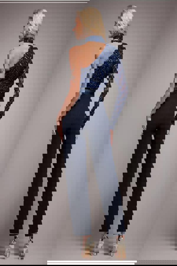 This bodycon jumpsuit has a sequin top with an asymmetric one-shoulder neckline teamed and a scuba tapered trouser with side pockets.