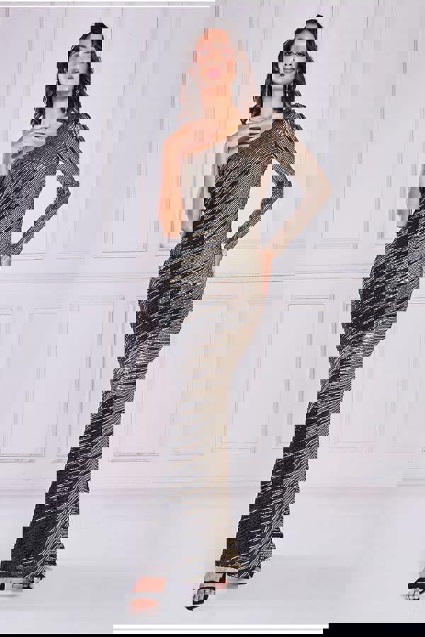 Make an unforgettable entrance at your next black tie occasion with our One Sleeve Diagonal Sequin Maxi Dress.