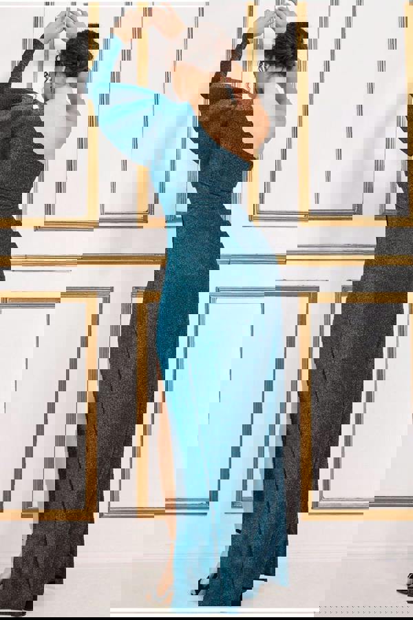 The One Sleeve Frill Lurex Maxi is a gorgeous evening dress that features a ruffled shoulder detail.