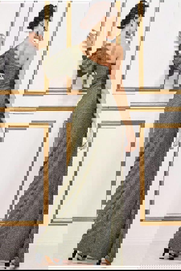 The One Sleeve Frill Lurex Maxi is a gorgeous evening dress that features a ruffled shoulder detail.