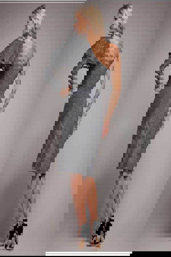 This beautifully fitted one-shoulder silver dress boasts luxurious details like frilled sleeves and thigh split detail.