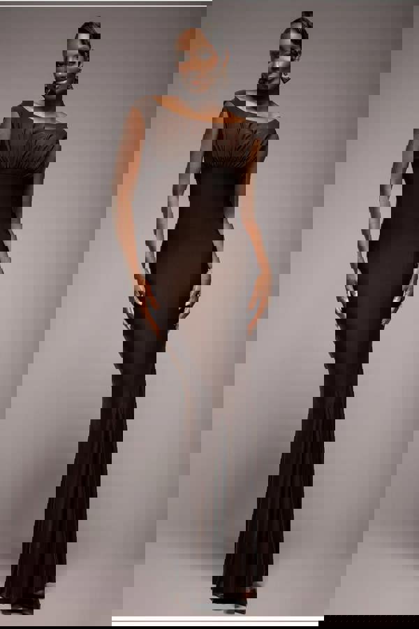 Brown glamour meets contemporary elegance with the Goddiva Open Back Cowl Neck Gathered Maxi Dress.